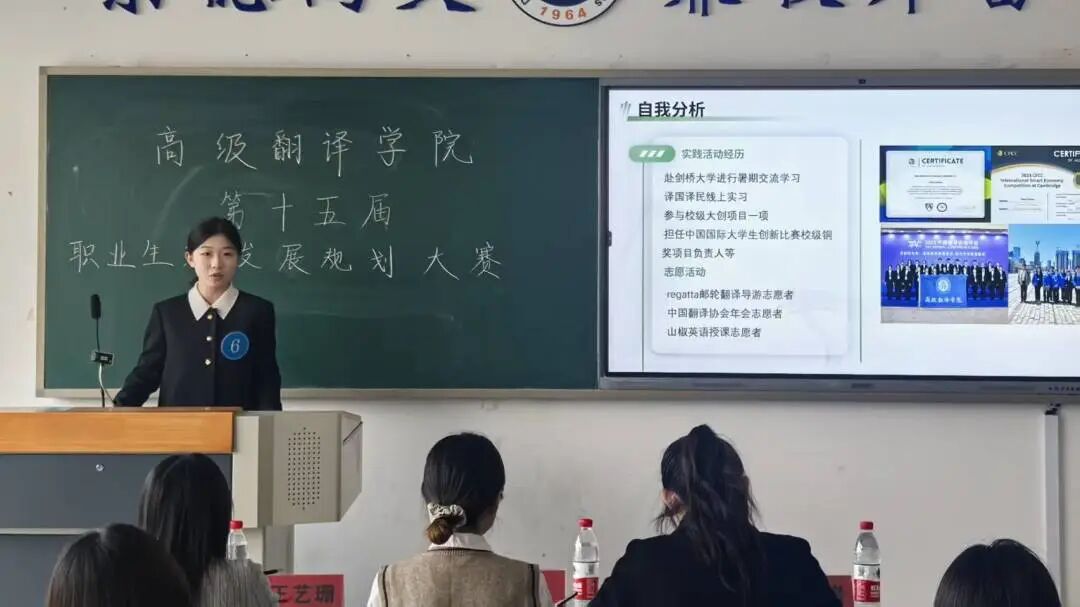 决赛设置三大核心环节,层层递进考察选手职业综合素养。演讲答辩环节中,七位选手充分彰显高翻学子的专业风采与思维深度。他们灵活运用霍兰德职业分析、MBTI人格测评、DISC性格测试等专业工具,将自我特质深度剖析与行业趋势精准研判有机结合,围绕职业定位逻辑、过往实践积淀、分阶段成长路径、潜在风险应对等核心内容展开系统阐述。选手们通过各具巧思的PPT动态演示与个性化简历呈现,既清晰勾勒出英语教师、国际组织成员等多元职业发展蓝图,更传递出将语言专业专长融入时代发展需求的职业追求与责任担当。