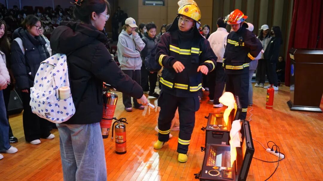 消防救援人员现场讲解了各类灭火器的适用场景、识别方法与操作规范,同时针对宿舍、教学楼等重点场所的室内消火栓系统,详细介绍了相关设备组成、操作流程与使用注意事项,引导大家规范操作,确保全体参训人员切实掌握基本火灾扑救技能。此外,培训还细致讲解了火灾应急处置流程与火场逃生核心要点。钱笑岩队长特别强调,成年公民负有依法参与初期火灾扑救的义务,但施救过程中必须坚持科学处置、确保自身安全,坚决杜绝盲目施救行为。